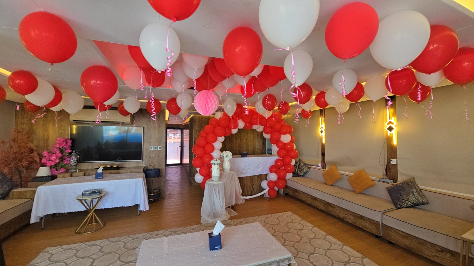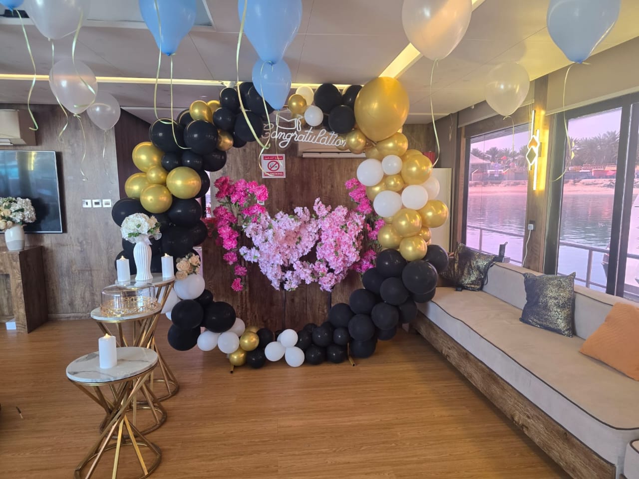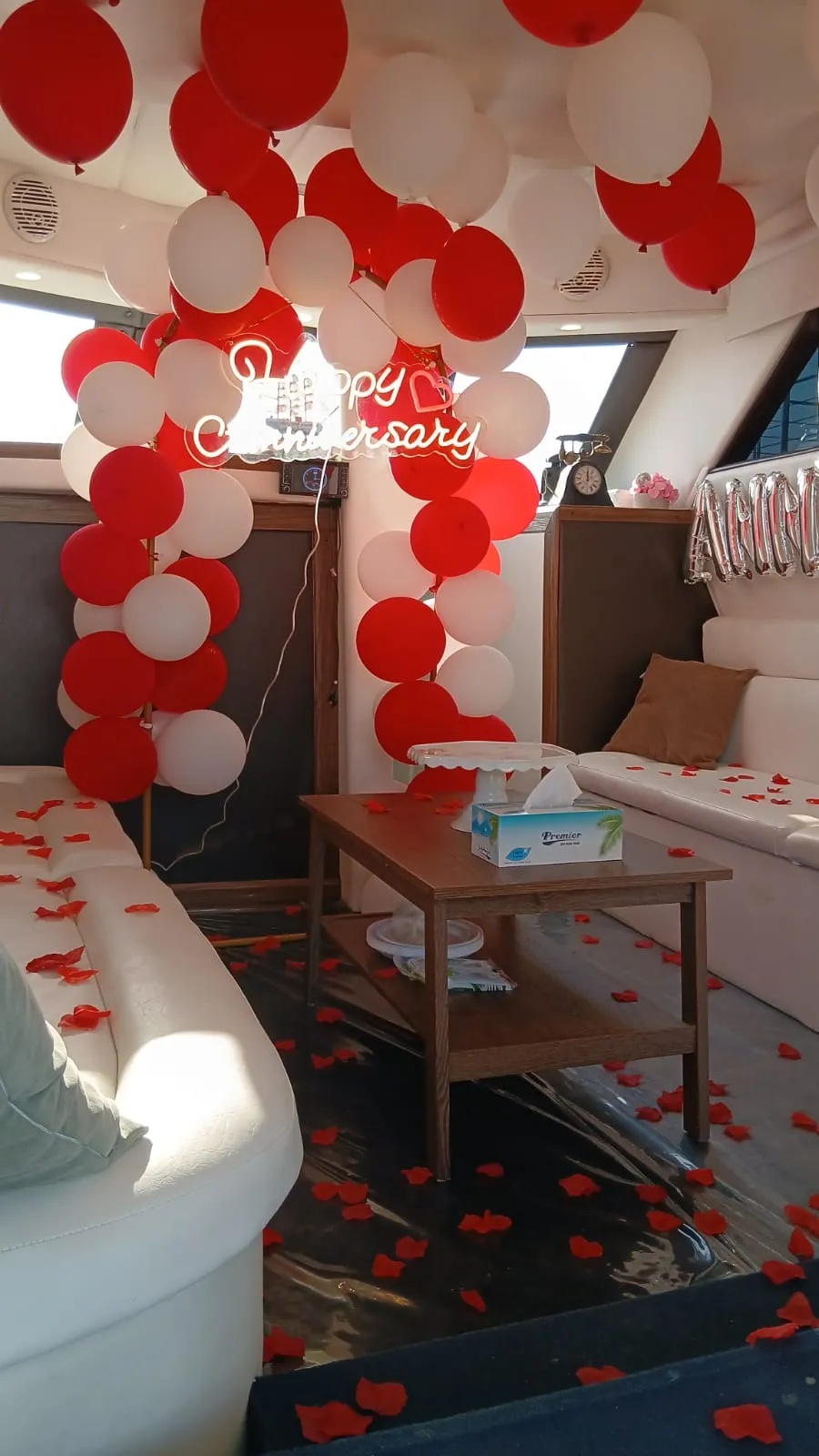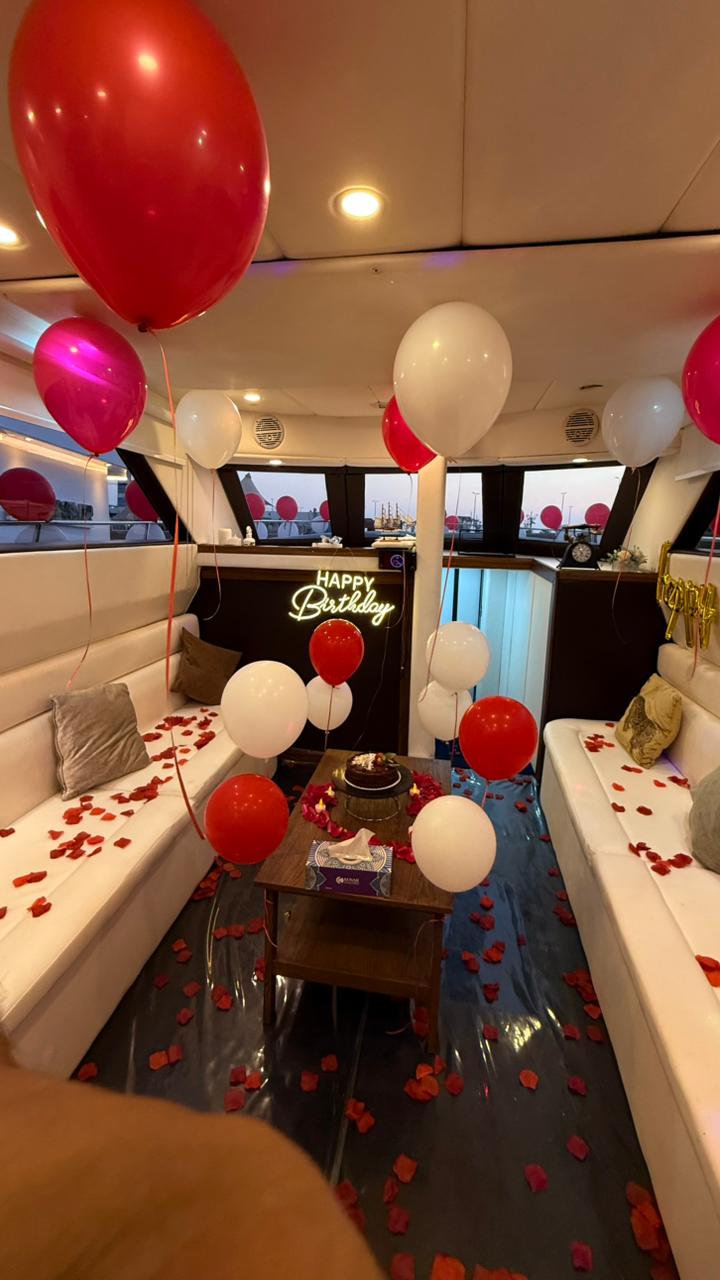 Make your celebration unforgettable with our Small Anniversary Setup on board. Includes a romantic red & white balloon décor, “Happy Anniversary” neon sign, rose petals on seating and in the cabin, and a small stand/table setup—perfect for surprises, proposals, or a sweet anniversary moment.